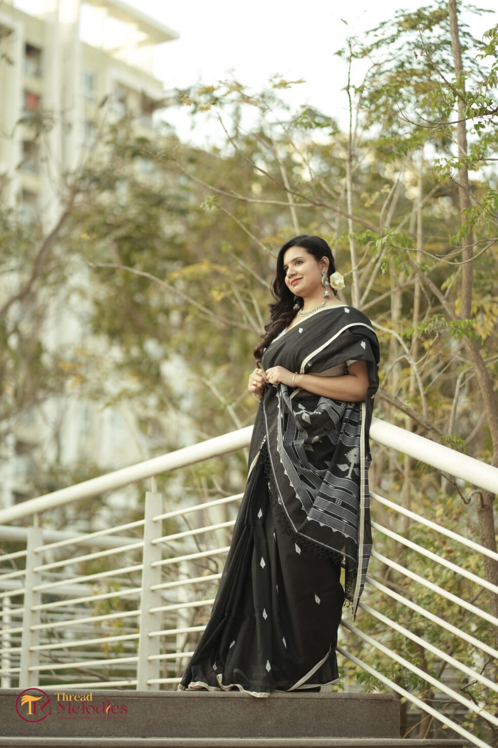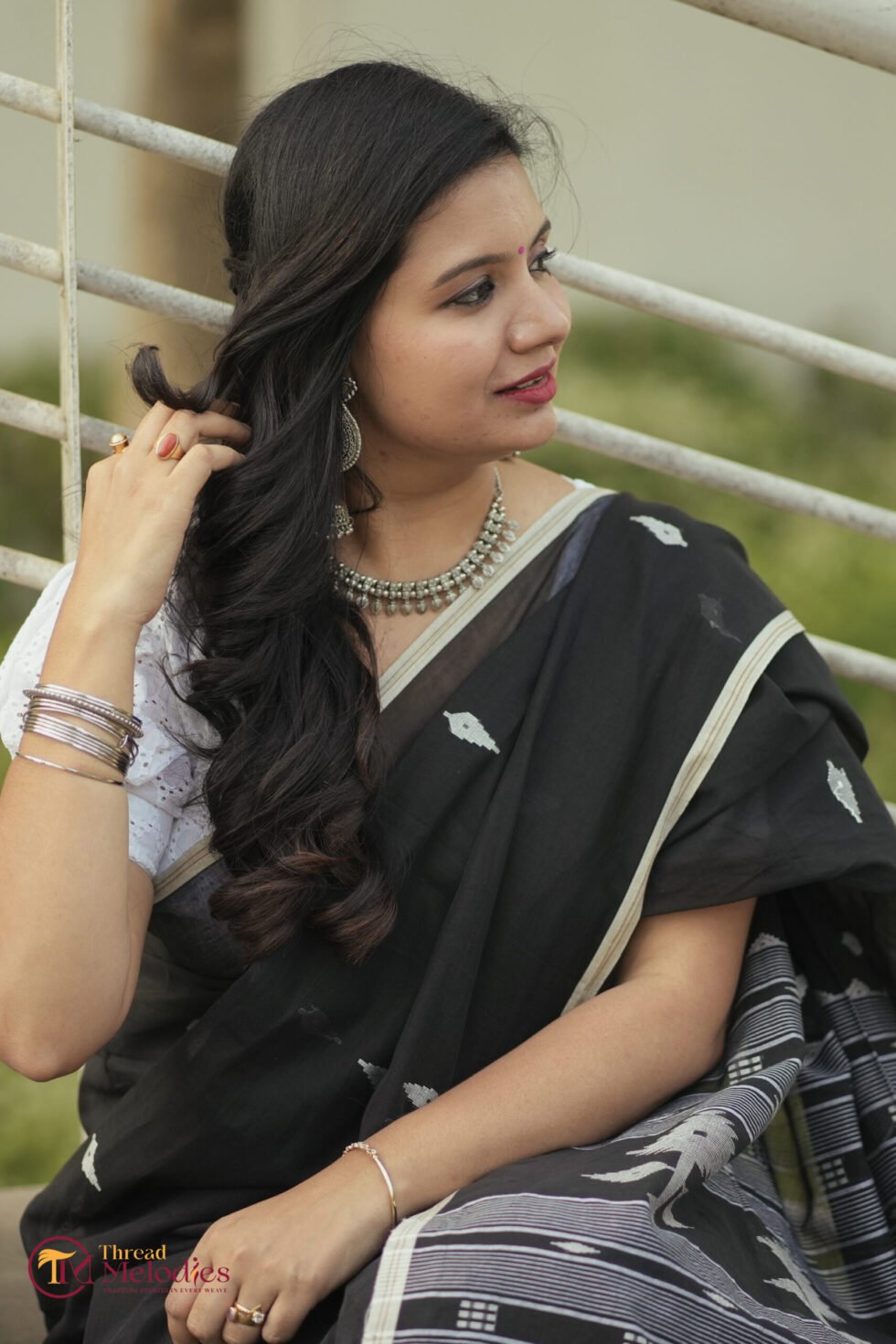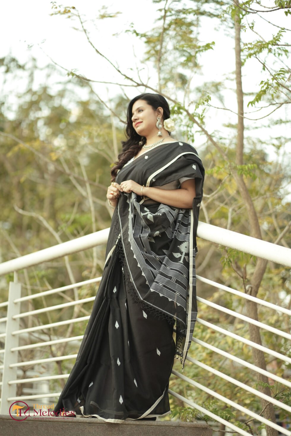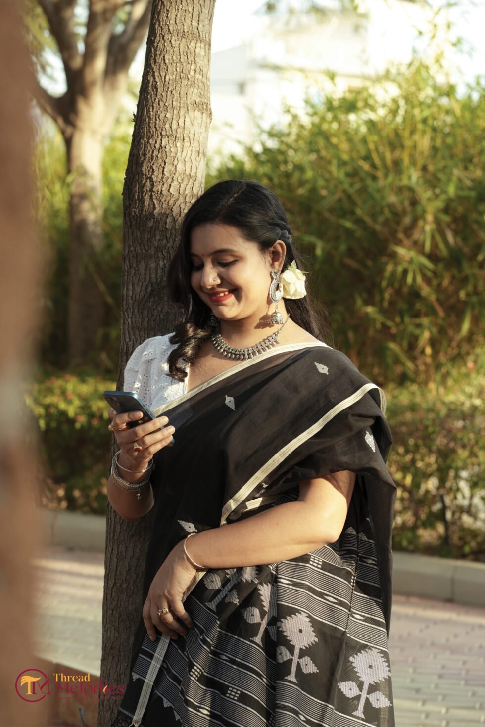 Rendered in a classic combination of black and white, the saree reflects timeless elegance with a striking contrast. The lightweight cotton fabric offers breathability and comfort while preserving a crisp, handcrafted look