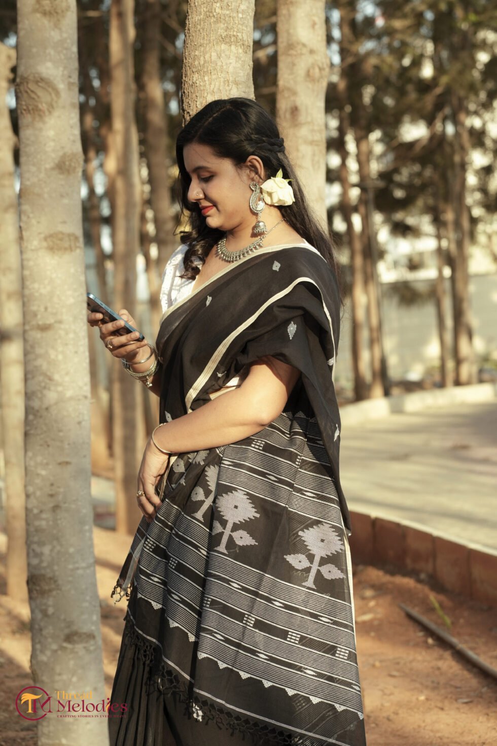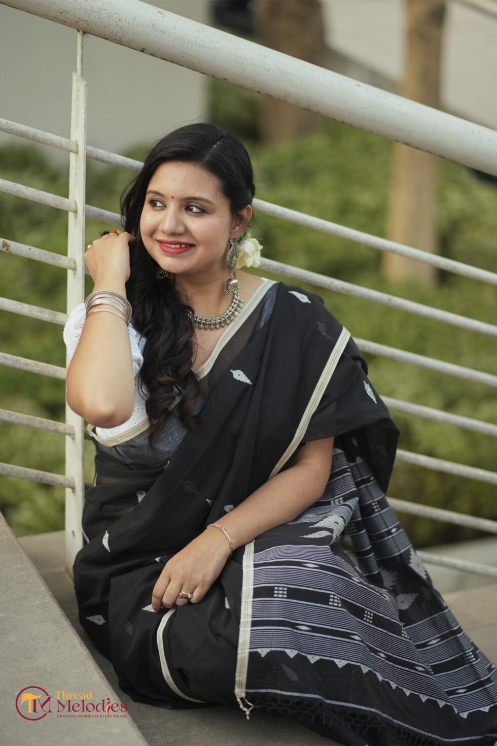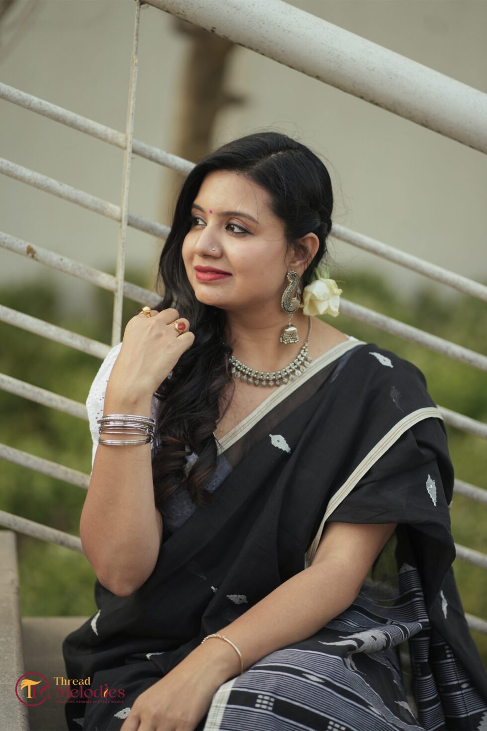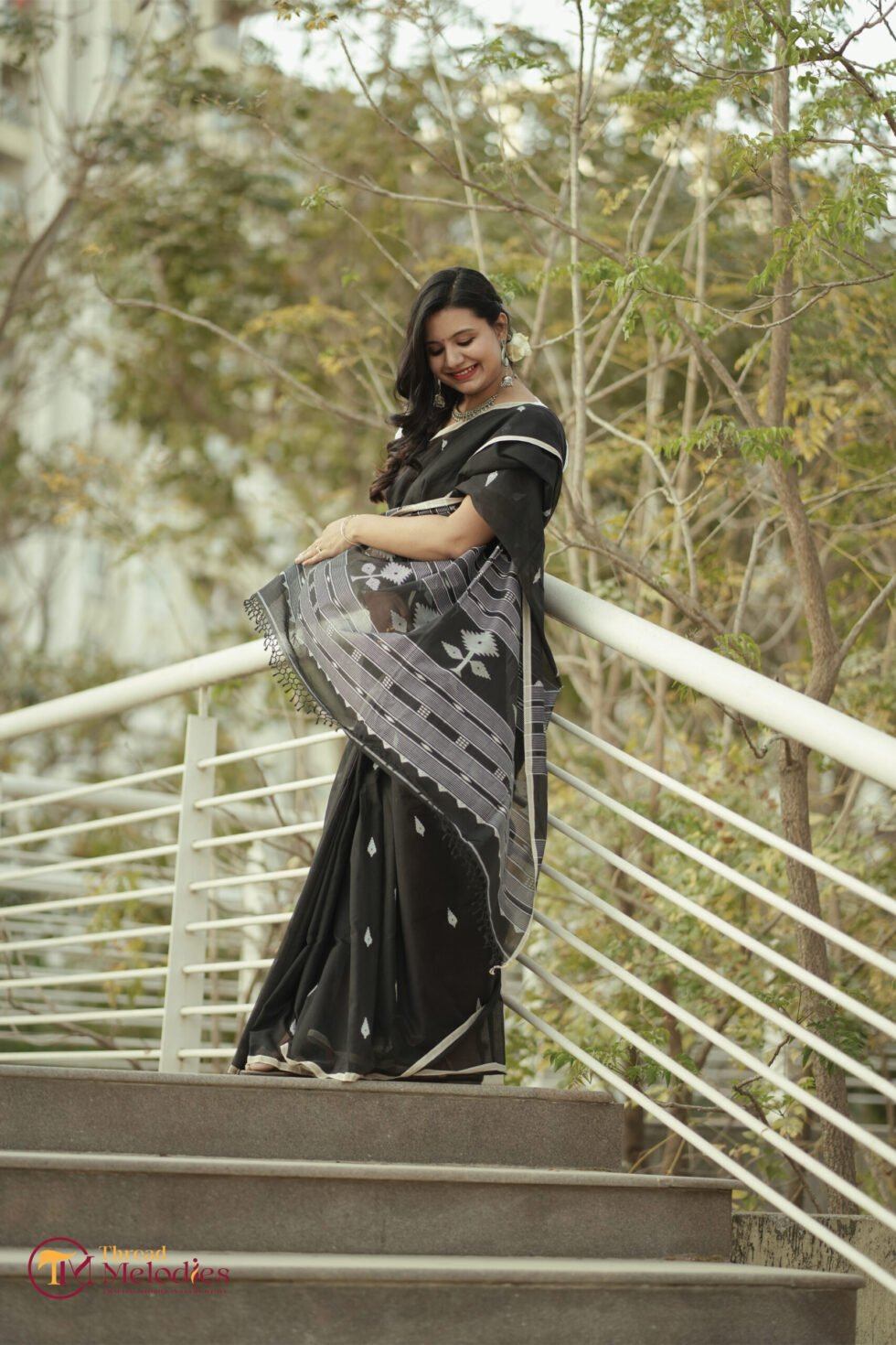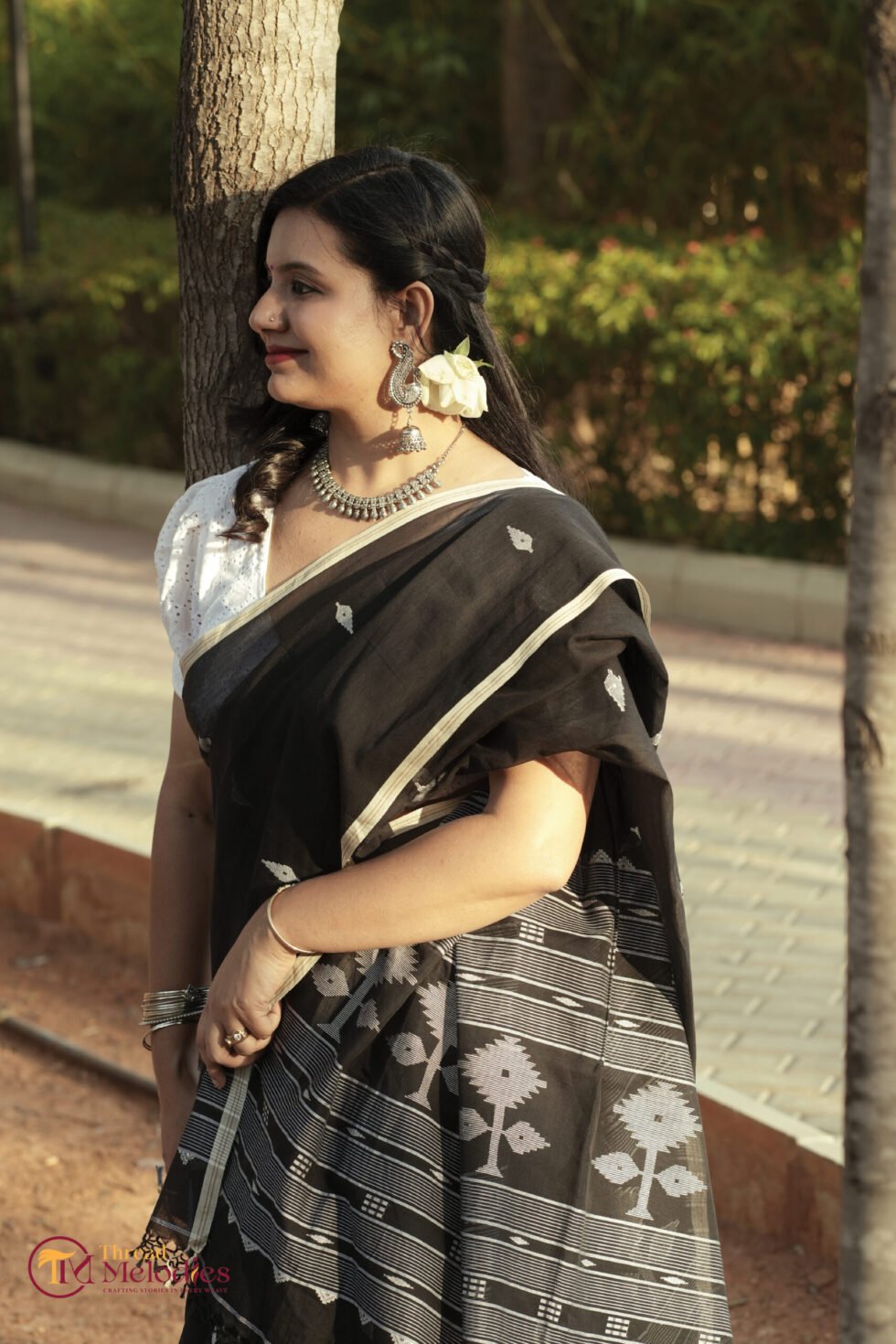 Rendered in a classic combination of black and white, the saree reflects timeless elegance with a striking contrast. The lightweight cotton fabric offers breathability and comfort while preserving a crisp, handcrafted look