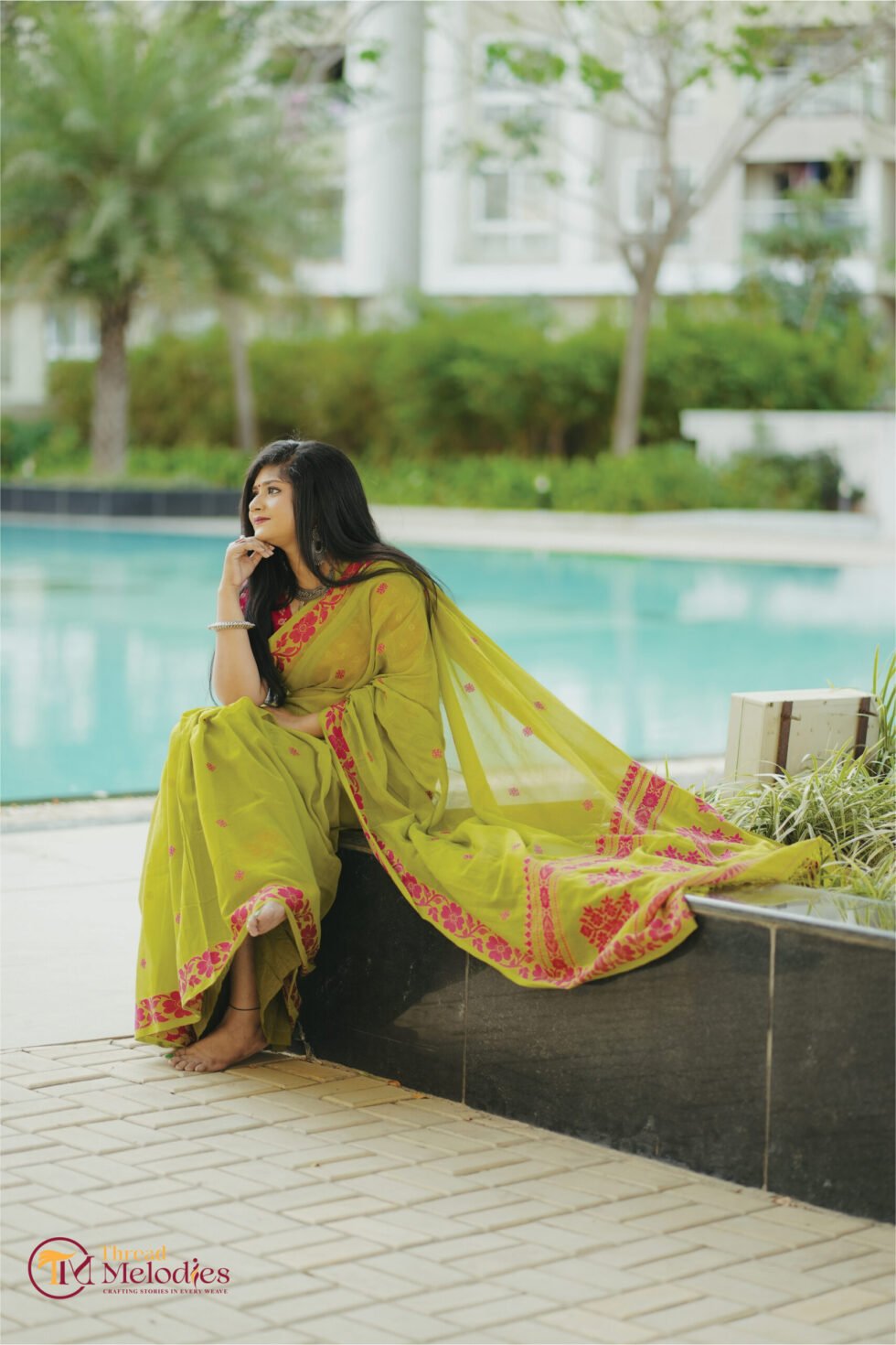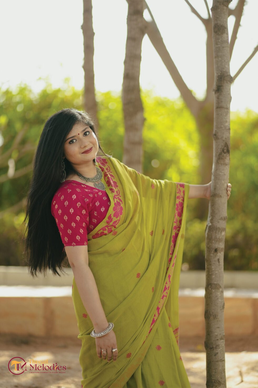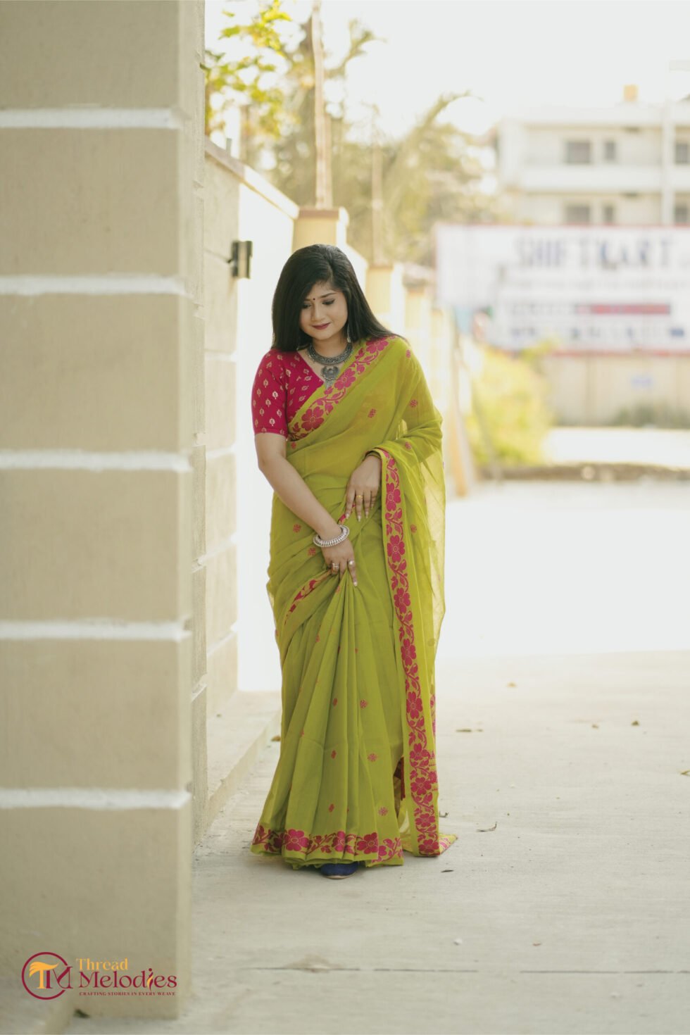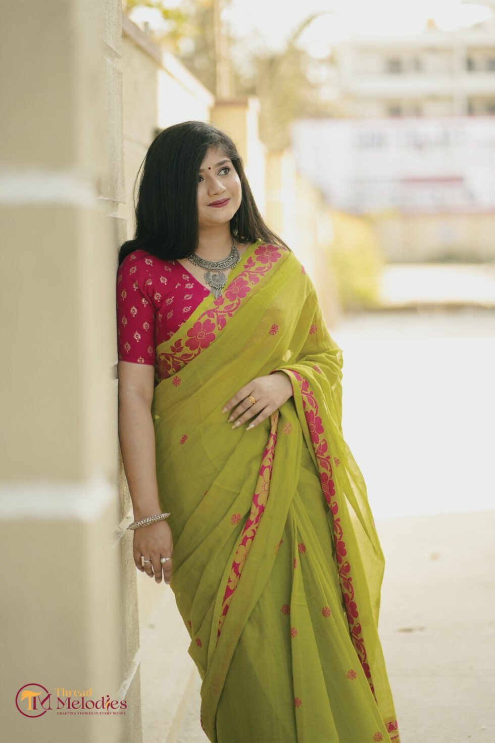 Rendered in a lively blend of lime green and pink, the saree feels fresh and cheerful, with a vibrant charm that stands out beautifully. The breathable cotton fabric ensures comfort while maintaining a graceful handloom finish.