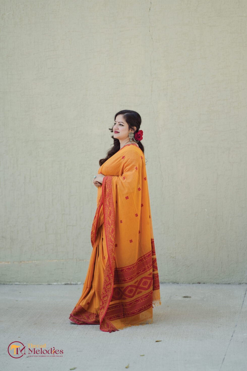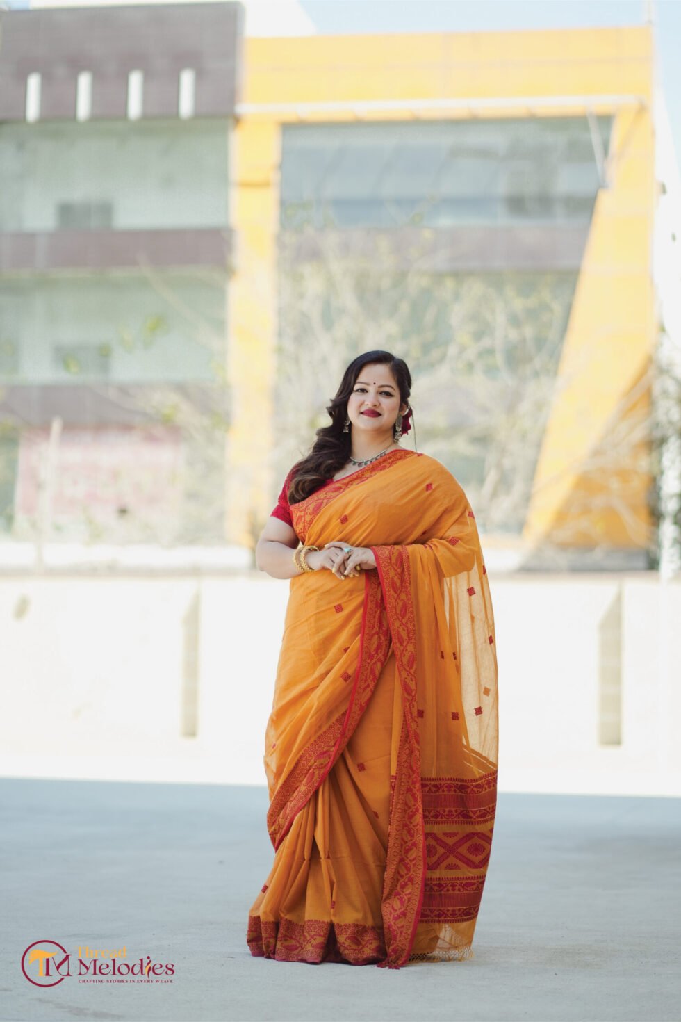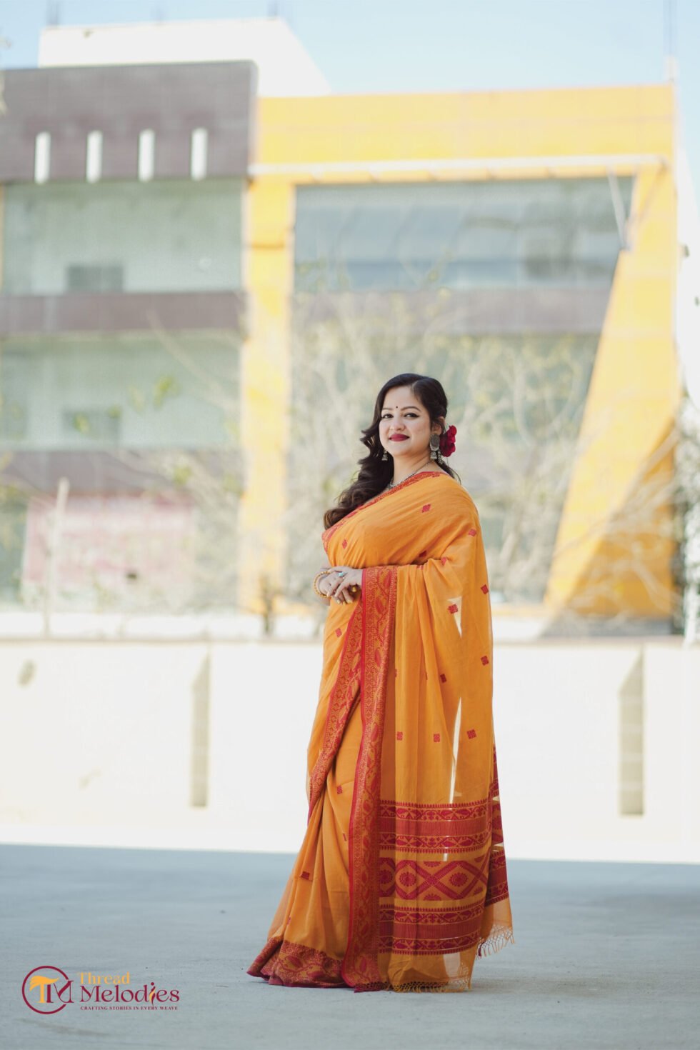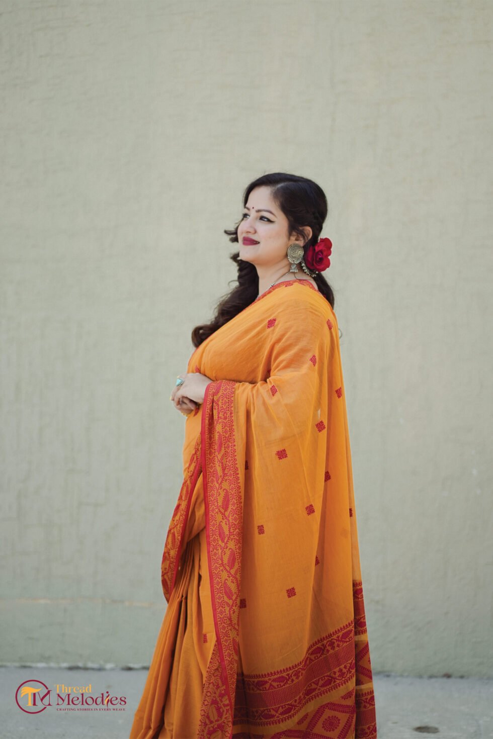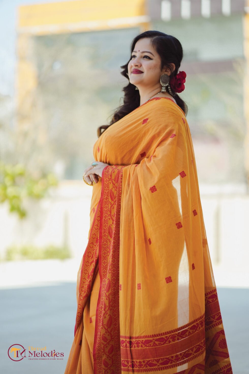 Finished in a bright yellow tone, the saree is lightweight, breathable, and comfortable, making it ideal for everyday and festive wear.