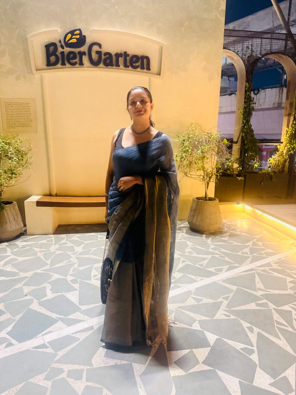 Half linen–half zari handwoven saree, crafted by skilled artisans in West Bengal using traditional handloom techniques. The saree features a balanced composition of linen and zari, creating a refined interplay of matte texture and subtle metallic sheen.