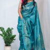 Pure linen handwoven saree, crafted by skilled artisans in West Bengal using traditional Jamdani weaving techniques. The saree features floral Jamdani motifs woven across the body, complemented by zari stripe detailing on the pallu, adding a subtle contrast and festive elegance.