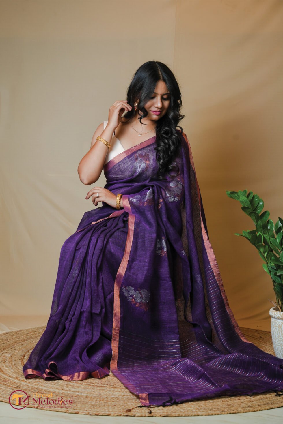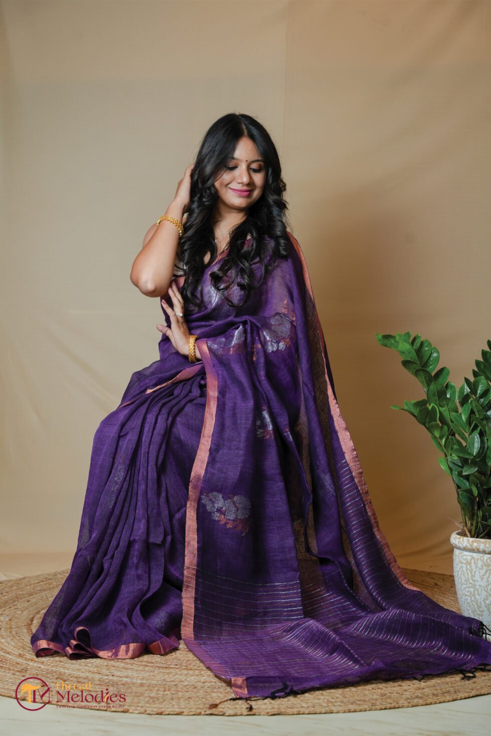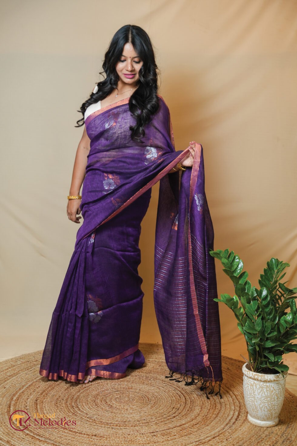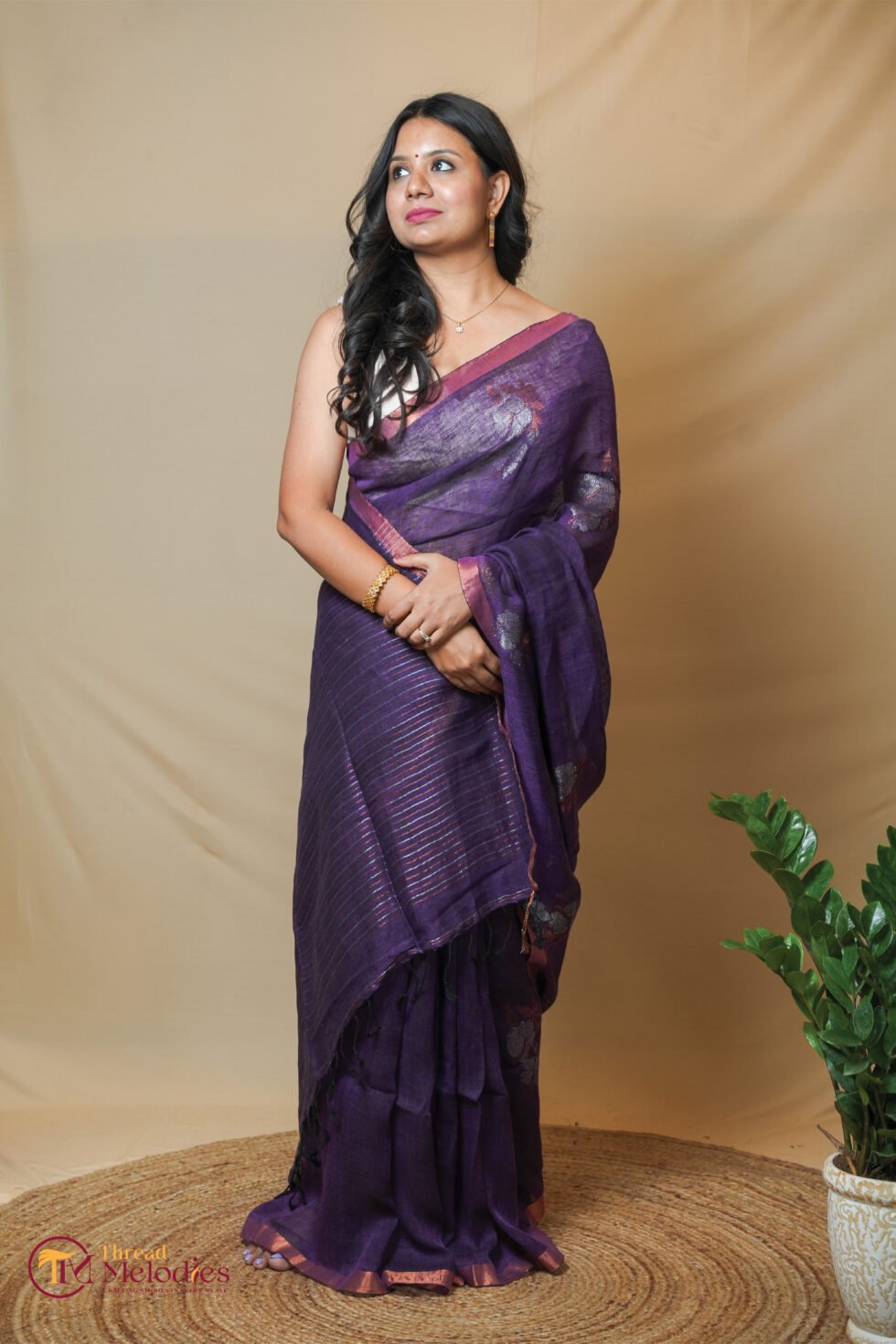 Finished in a rich purple tone, the saree has a deep, refined appeal. The linen fabric is breathable and lightweight, offering a naturally textured drape.