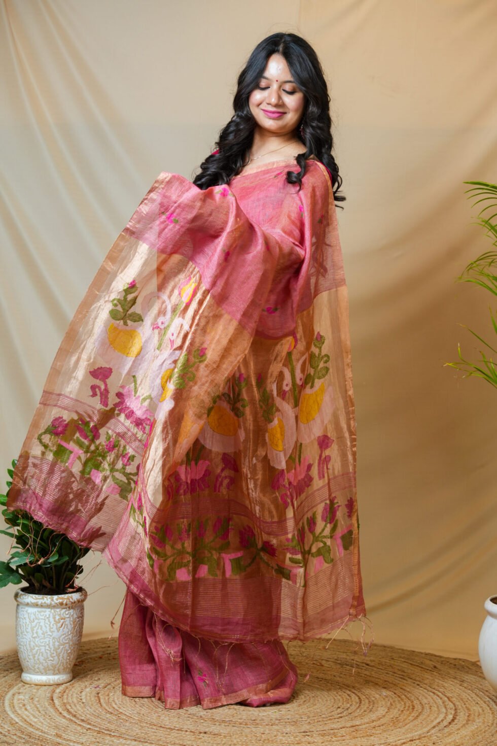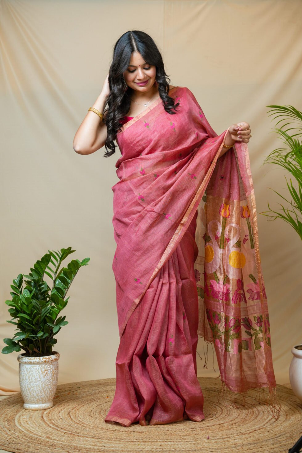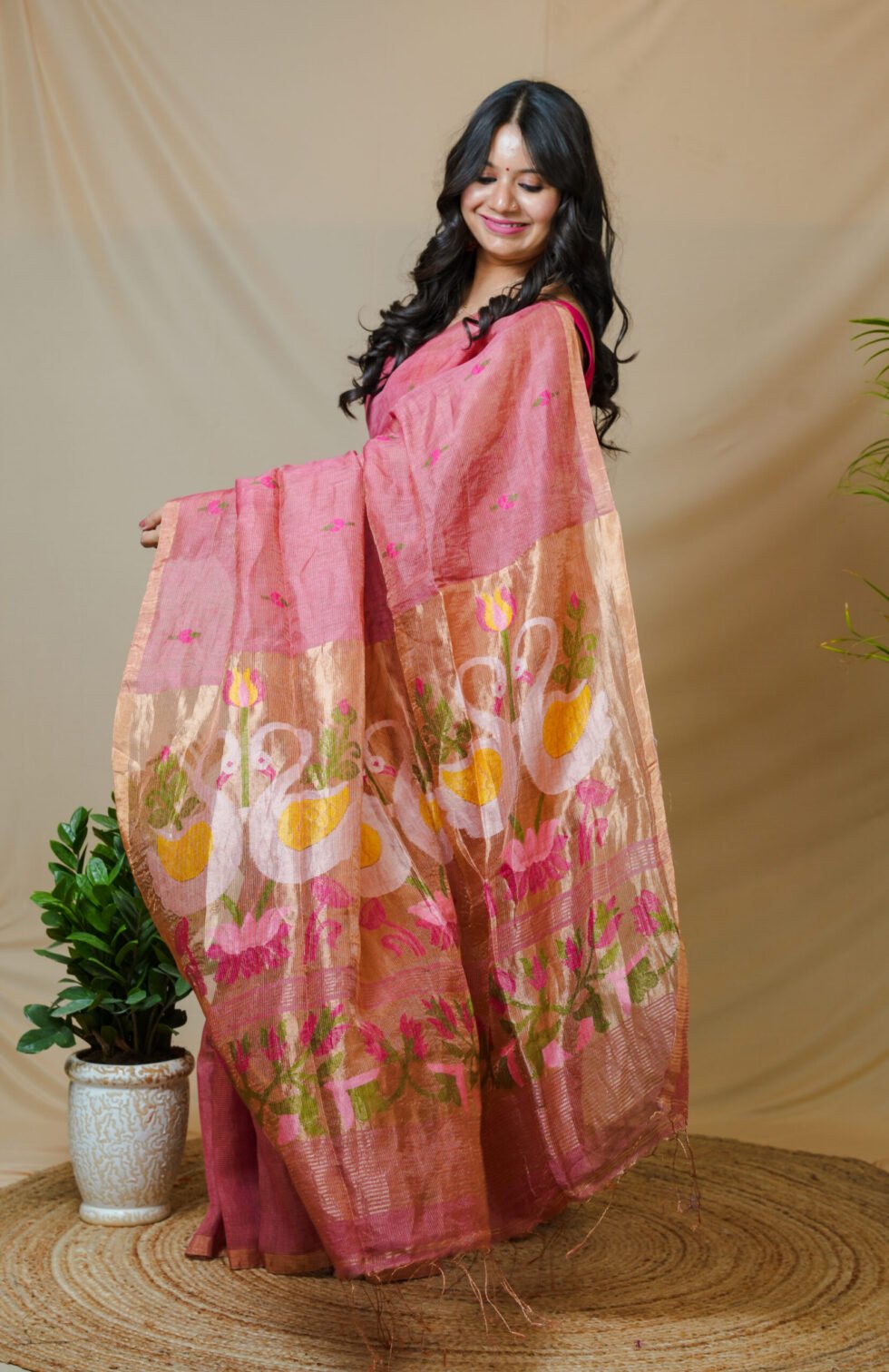 Pure silk linen handwoven saree, crafted by skilled artisans in West Bengal using traditional handloom techniques. The saree features small lotus motifs across the body and an elegant swan motif on the pallu, symbolising grace and purity.