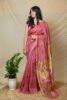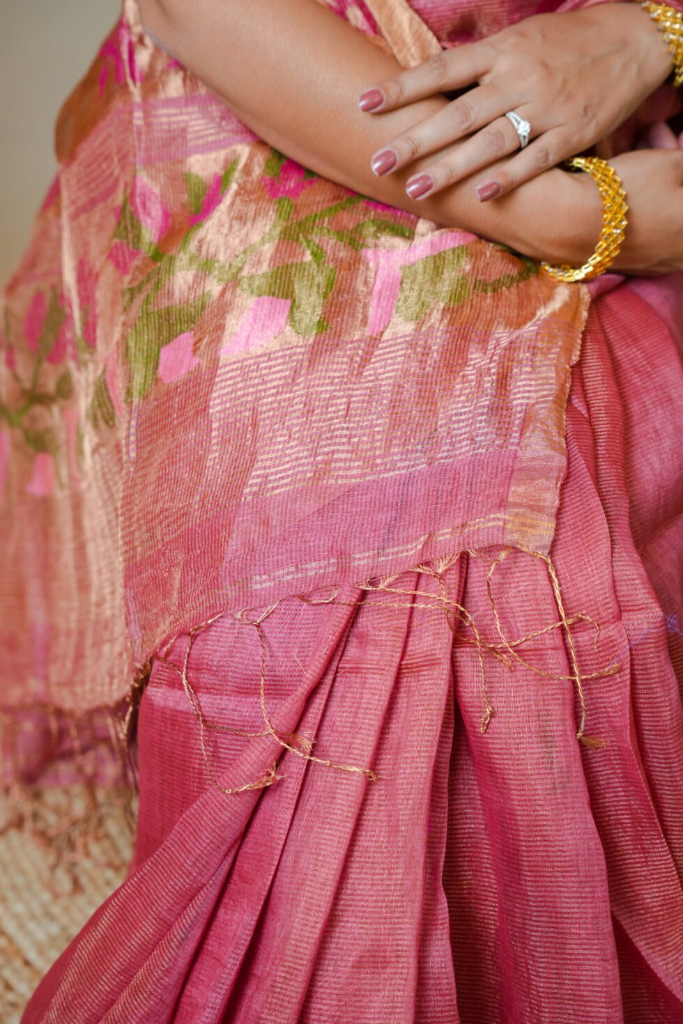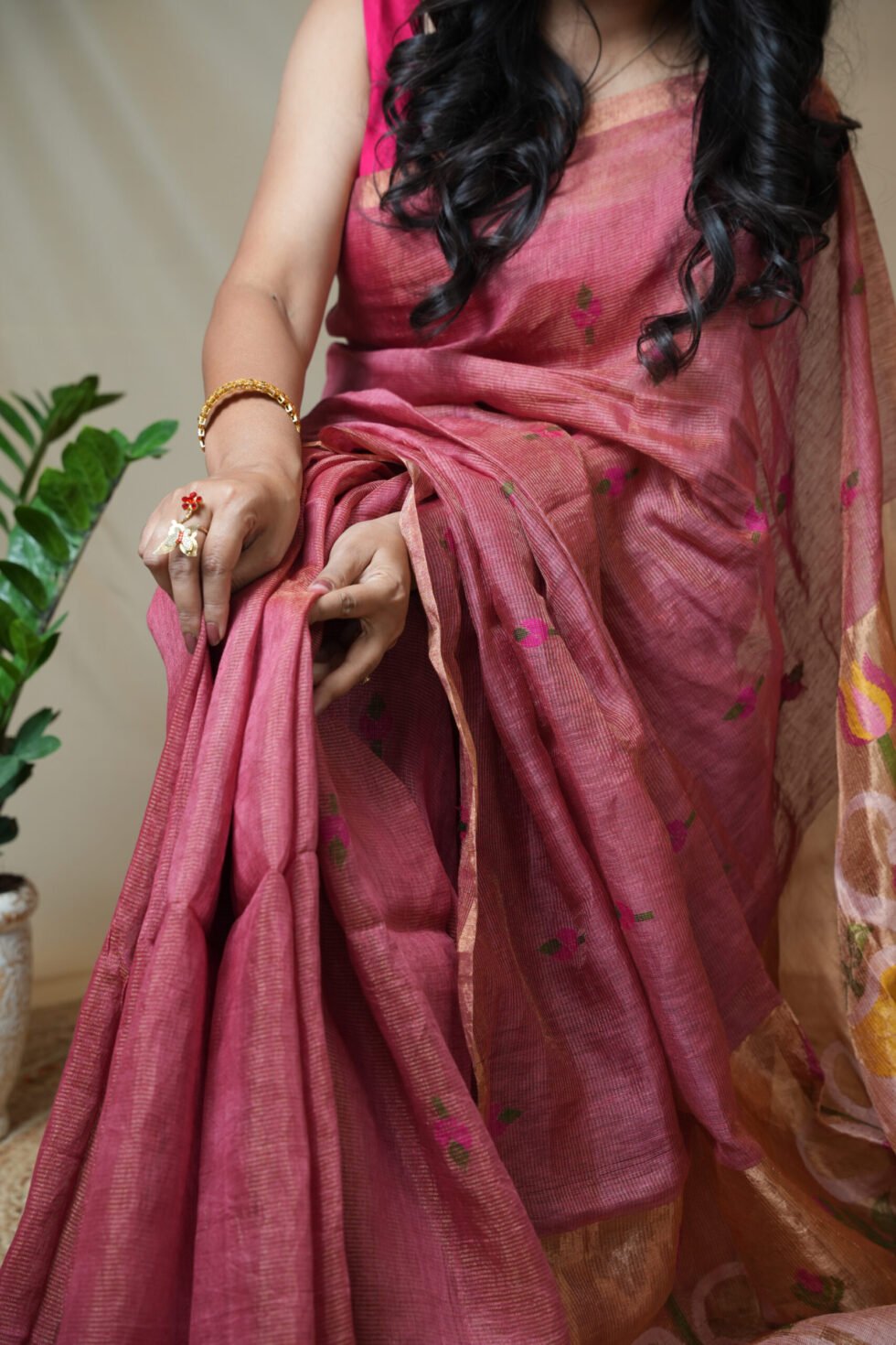 The saree is finished in a soft earthy mauve tone with a subtle sheen. The Resham silk–linen blend is breathable, lightweight, and naturally textured.