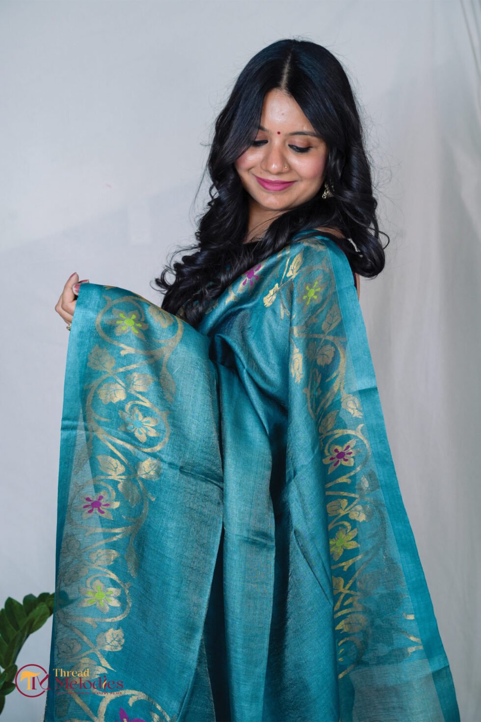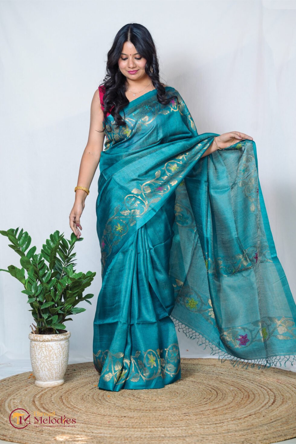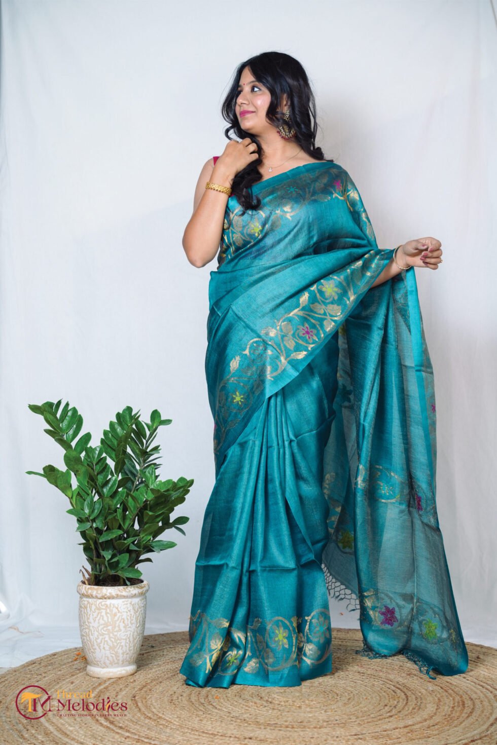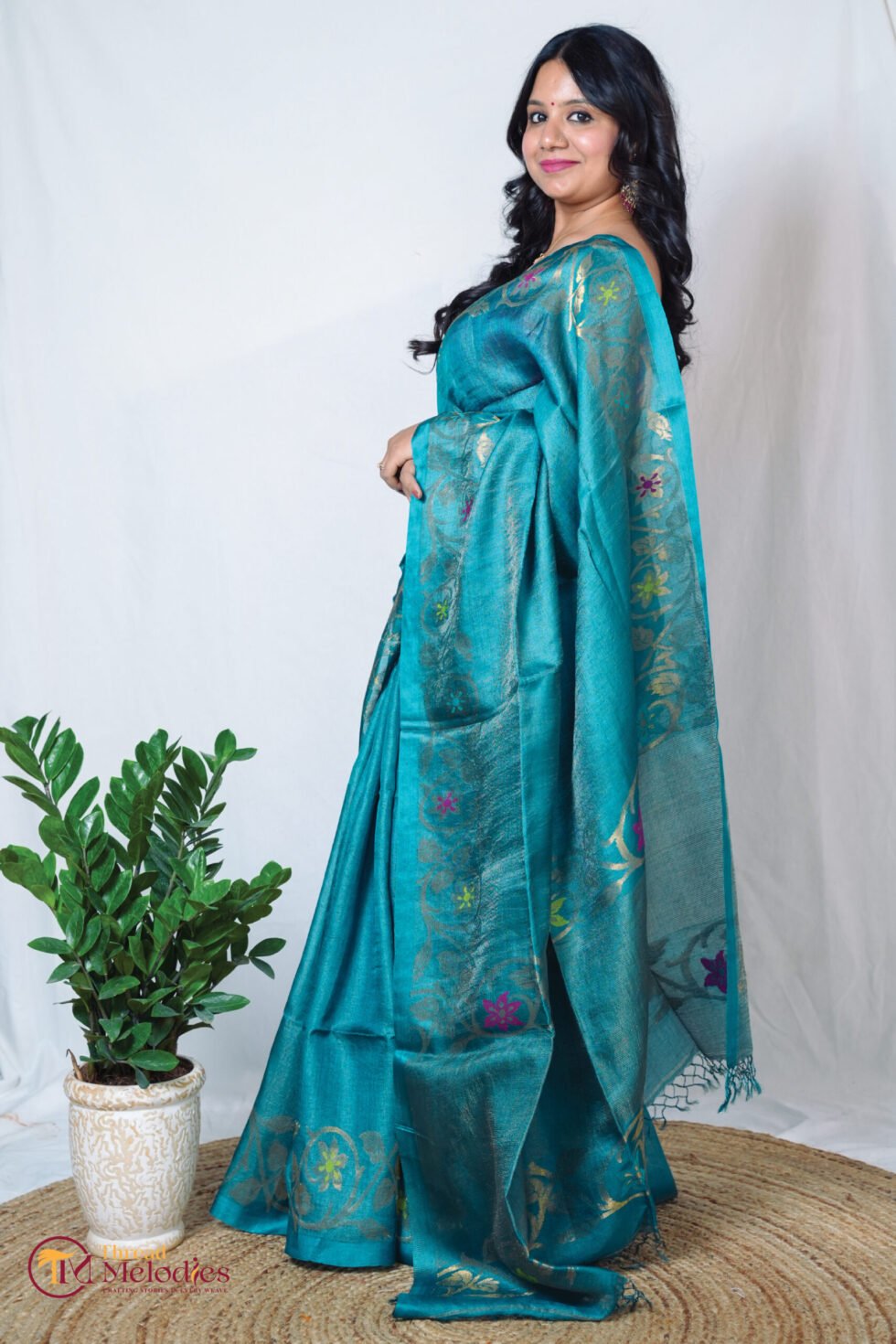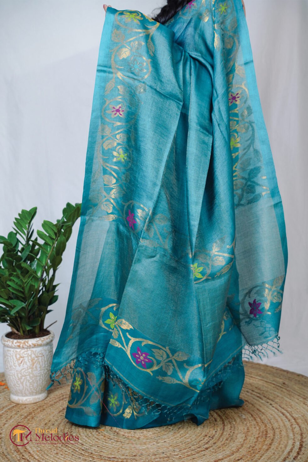 Finished in a rich peacock blue tone, the saree has a soft, luminous sheen and an elegant fall. The tussar–tissue silk blend lends fluidity, comfort, and a refined handcrafted texture.